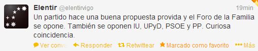 «Elentir» twiteaba: «un partido hace una buena propuesta provida y el Foro dela Familia se opone. También se oponen IU, UPyD, PSOE y PP. Curiosa coincidencia«. @Pensamientodisidente aseguraba: «Benigno Blanco hace más daño a la causa provida que todos los abortorios juntos».