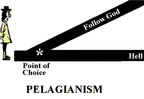 Según la herejía de Pelagio, formulada a comienzos del siglo V: la naturaleza humana está sana, no está profundamente herida por un pecado original, y no necesita estrictamente del auxilio sobre-natural de la gracia de Cristo. Nuestro Señor Jesucristo es por tanto para nosotros causa ejemplar de la salvación, pero no causa eficiente. Optimismo antropológico: querer es poder. Devaluación consecuente de la oración de petición, de la necesidad de los sacramentos, etc… En definitiva, el gráfico que ilustra este artículo lo explica de maravilla: el pecado original no habría contaminado verdaderamente la naturaleza humana, por lo que el hombre sería capaz de elegir el bien y no pecar por sí mismo, sin la ayuda de la gracia.