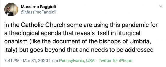 “En la Iglesia Católica algunos están usando esta pandemia para una agenda teológica que se revela en el onanismo litúrgico (como el documento de los obispos de Umbría, en Italia) pero que va más allá y necesita ser contestada”, escribe el profesor Faggioli, famoso en los círculos del catolicismo liberal de ambas costas del atlántico, desde su muy frecuentada cuenta de Twitter.