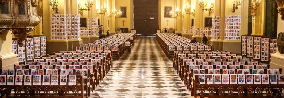 Las fotografías, correspondientes a muertos por coronavirus, fueron colocadas en los bancos del templo, así como en columnas y paneles.