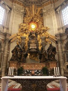 El gran trono de bronce [en el ábside de la basílica, también diseñado por Bernini] encierra una silla de madera del siglo IX… que durante mucho tiempo se consideró como la propia silla de san Pedro… [y] fue colocada sobre este monumental altar por su gran valor simbólico. Expresa la presencia permanente del Apóstol en el magisterio de sus sucesores».