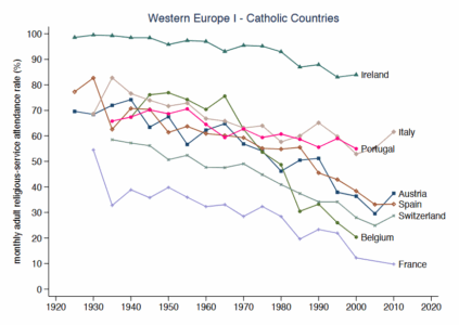 El estudio del NBER no proporciona cifras exactas año a año para España, pero señala claramente que entre 1950 y 2010 la asistencia mensual a Misa ha caído de niveles superiores al 50% hasta cifras por debajo del 25%. La aproximación de una caída de 35 puntos porcentuales es coherente con la tendencia observada y sirve para ilustrar la magnitud del fenómeno. La ausencia de datos exhaustivos año a año no impide constatar que España se encuentra entre los países con un declive más pronunciado en la práctica sacramental, sin embargo es de los que ha presentado un mayor descenso en la región.