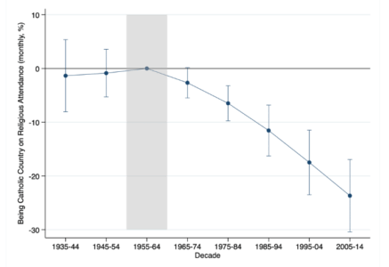 El informe del NBER no acusa directamente al Concilio, pero señala el lapso entre 1965 y 1964 como punto de inflexión. Los datos son inapelables: la caída en la práctica comienza inmediatamente después, y en países donde la identidad católica era más fuerte, como España, la pérdida ha sido más dramática.
