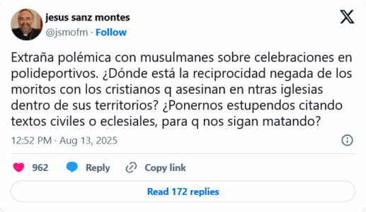 En un mensaje publicado en la red social X, Sanz califica la controversia como una “extraña polémica” y cuestiona la ausencia de reciprocidad por parte de los países de mayoría musulmana, donde los cristianos sufren persecución, atentados y restricciones graves a su libertad de culto. “¿Dónde está la reciprocidad negada de los moritos con los cristianos que asesinan en nuestras iglesias dentro de sus territorios?”, pregunta el prelado, recordando que en esos lugares es impensable organizar celebraciones cristianas en espacios públicos.