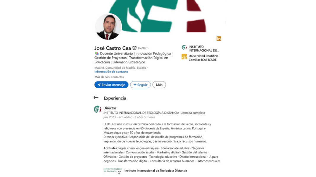 Sin embargo, mientras las instituciones guardan silencio, el propio perfil público de Castro en LinkedIn lo presenta desde junio de 2023 como Director del Instituto Internacional de Teología a Distancia, cargo que mantiene vigente hasta la fecha. En dicha plataforma, el sacerdote figura como “director ejecutivo” y responsable del desarrollo de programas de formación, gestión económica y de recursos humanos del instituto.