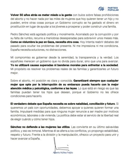 El presidente del Partido Popular, Alberto Núñez Feijóo, ha publicado una carta en la que despeja cualquier ambigüedad sobre su posición en materia de aborto y deja claro que su partido mantendrá intacto el “derecho” a interrumpir el embarazo, comprometiéndose a garantizarlo con los mejores medios médicos y psicológicos.