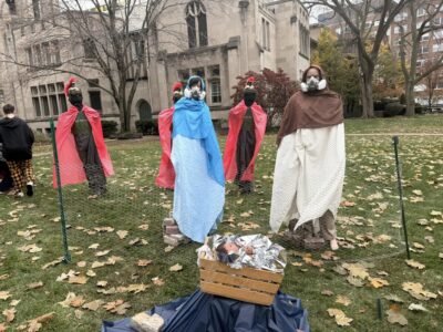 En la Lake Street Church de Evanston (Illinois), la instalación muestra al Niño Jesús con bridas en las muñecas, representado como detenido por ICE. La figura de la Virgen aparece con una máscara antigás aludiendo al uso de gas lacrimógeno en protestas contra agentes migratorios.