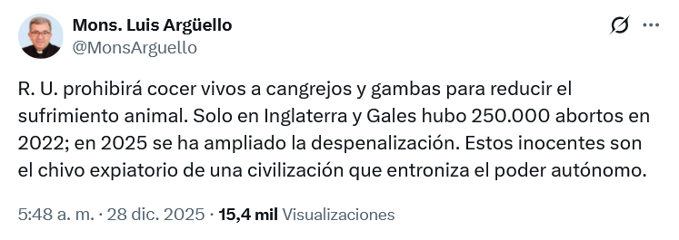 Mons. Argüello ha hecho bien en recordar una verdad incómoda: mientras algunos gobiernos occidentales legislan con creciente sensibilidad para evitar el sufrimiento animal, permiten —y amplían— la eliminación sistemática de vidas humanas inocentes mediante el aborto. La reciente decisión del Reino Unido de prohibir cocer vivos cangrejos y gambas contrasta de forma hiriente con la cifra de más de 250.000 abortos registrados en Inglaterra y Gales en 2022 y con la posterior ampliación de su despenalización. Señalar esa contradicción moral no es demagogia: es un deber.
