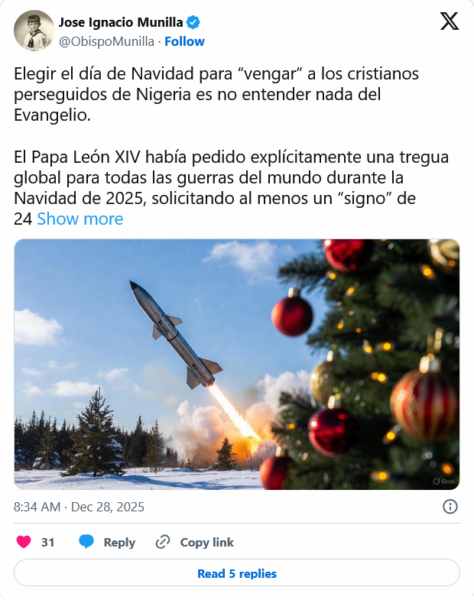Porque conviene decirlo claro: Munilla no está escandalizado por la violencia, está escandalizado por quién la ejerce. El problema no es el bombardeo al ISIS; el problema es que lo haga Trump. Si mañana la misma operación la firmara un líder con carné progresista, lenguaje terapéutico y bendición de La Civiltà Cattolica, aquí no habría tuit, ni reproche evangélico, ni súbita sensibilidad navideña.