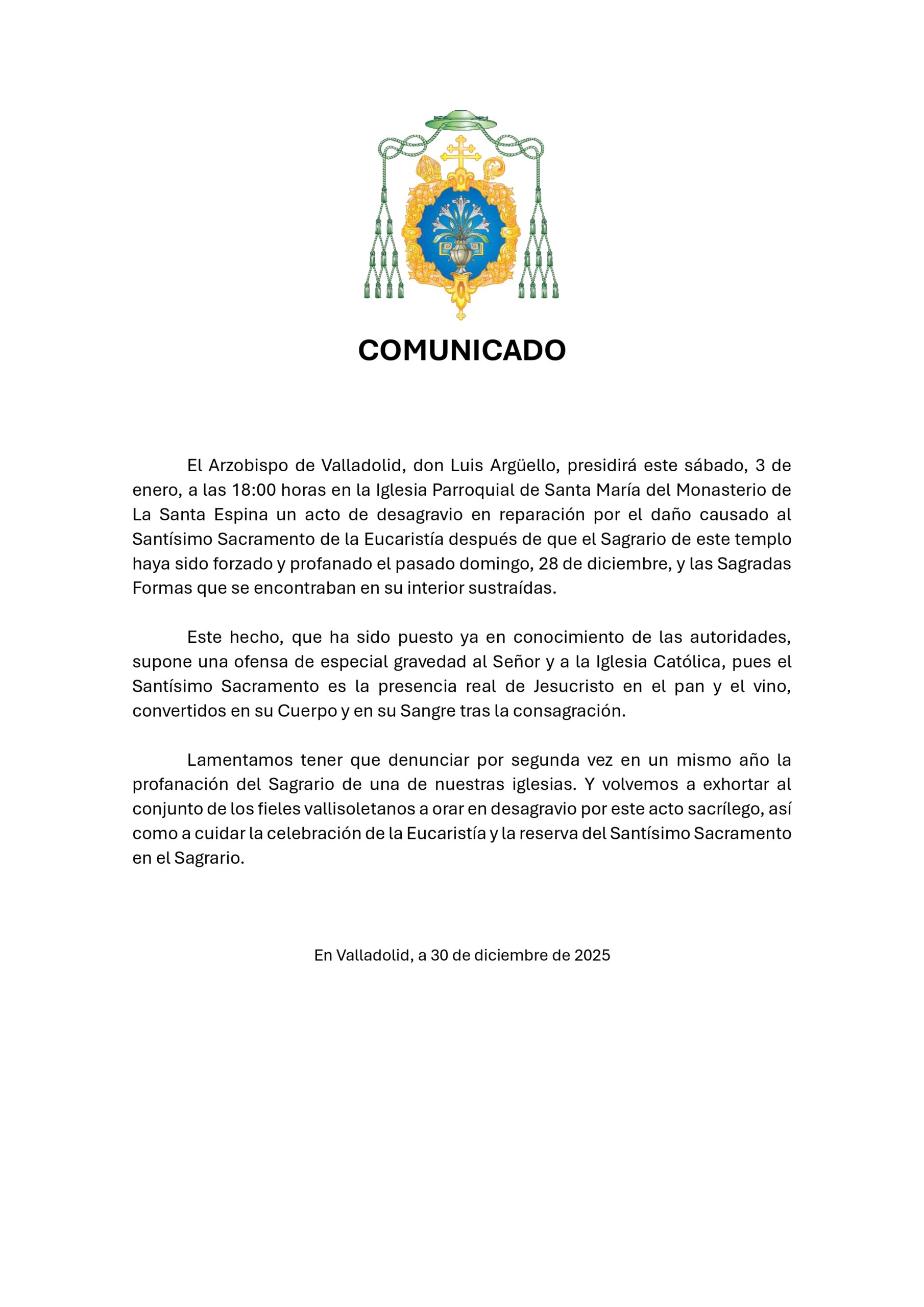 El arzobispo de Valladolid, monseñor Luis Argüello, presidirá este sábado 3 de enero, a las 18:00 horas, un acto de desagravio en la iglesia parroquial de Santa María del Monasterio de La Santa Espina, en reparación por la profanación del Sagrario ocurrida el pasado domingo 28 de diciembre.