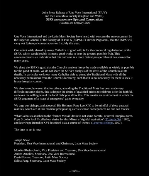 Una Voce International y la Latin Mass Society han recibido con preocupación el anuncio realizado por el Superior General de la Fraternidad Sacerdotal San Pío X (FSSPX), el padre Davide Pagliarani, de que la FSSPX llevará a cabo consagraciones episcopales el próximo 1 de julio de este año.