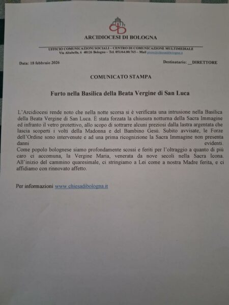 La Archidiócesis de Bolonia ha denunciado un robo perpetrado en la noche del 17 al 18 de febrero en la Basílica de la Beata Virgen de San Luca, uno de los santuarios marianos más emblemáticos del norte de Italia. Según ha informado oficialmente la diócesis en un comunicado fechado el 18 de febrero, los intrusos forzaron el cierre nocturno de la Sagrada Imagen y rompieron el cristal protector con el objetivo de sustraer algunos objetos preciosos de la lámina plateada que enmarca los rostros de la Virgen y del Niño Jesús.