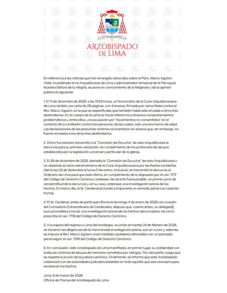 El 6 de marzo, el Arzobispado de Lima publicó un comunicado explicando su actuación en el caso. Un día antes, Infovaticana había publicado en exclusiva la carta enviada en diciembre a la curia limeña, en la que varios fieles denunciaban comportamientos problemáticos del sacerdote e incluían acusaciones de “tocamientos no consentidos” durante la confesión. En su respuesta, la archidiócesis dice: