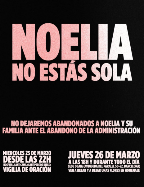 Fieles han convocado para este miércoles 25 de marzo una vigilia de oración en el hospital Sant Camil, en Sant Pere de Ribes (Barcelona), en apoyo a Noelia y su familia, quedando horas para que reciba la eutanasia.