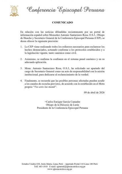 El punto más significativo es la decisión de Mons. Santarsiero de apartarse del cargo de secretario general de la Conferencia Episcopal Peruana. El texto lo presenta como un “acto de responsabilidad con la misión institucional”, orientado a facilitar el esclarecimiento de la verdad. Se trata de una medida de carácter político-eclesial, pero introduce un elemento que hasta ahora había estado ausente: la asunción de que la situación requiere distanciamiento y no blindaje.