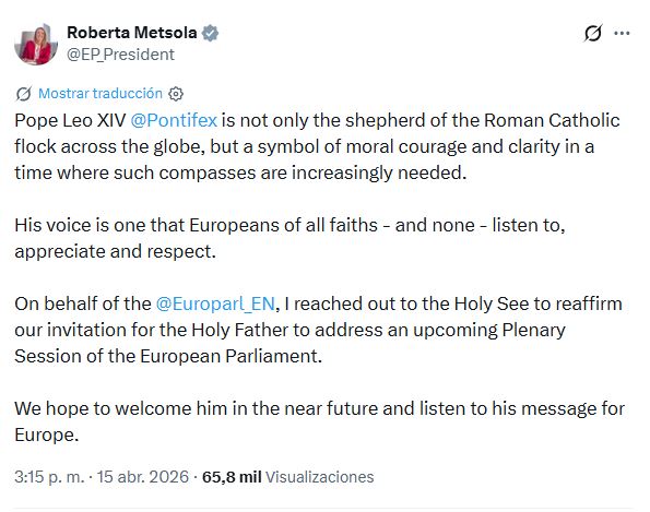 La presidenta del Parlamento Europeo, Roberta Metsola, anunció este miércoles 15 de abril que la institución ha renovado su invitación al Papa León XIV para que intervenga en una próxima sesión plenaria.