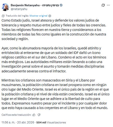 El primer ministro de Israel, Benjamín Netanyahu, ha reaccionado públicamente a la difusión de una imagen en la que un soldado israelí aparece dañando un crucifijo en el sur del Líbano, un hecho que ha generado inquietud entre los fieles cristianos.