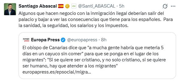 Frente a ese planteamiento, la reacción de Abascal pone el acento en las consecuencias sociales y económicas de la inmigración irregular, un enfoque que contrasta con el discurso centrado en la acogida que mantienen, en su mayoría, sectores eclesiales.