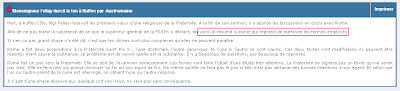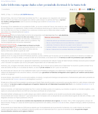 La imágen que encabeza esta entrada corresponde a la captura de pantalla de una nota publicada por agencia ACI, Sep-27-2011, de la cual les pedimos presten atención al texto que hemos destacado en rectángulos rojos. Dichos textos, segúnACI, corresponden a afirmaciones hechas por el Bernard Fellay, Superior General de la FSSPX/SSPX, respecto del «preámbulo doctrinal» entregado por la CDF a la FSSPX/SSPX en Sep-14-2011. ACI escribe: “Fellay dijo que…Asimismo aseguró que”, y acto seguido procede a entrecomillar unas palabras, lo que en teoría indicaría que estan citando verbatim a Fellay. Pero simplemente ello no es así; lo que ACI está citando corresponde a unos apartes de un post de Sep-26-2011 de un usuario (con el apodo de “Austremoine”) de un foro en francés llamado Fecit. Este usuario claramente hace la salvedad de que lo que escribe es “un breve resumen de memoria de los términos empleados” por Fellay. Aquí la captura de pantalla del foro aludido, en donde se ve claramente que todo lo escrito es de autoria de ese usuario y no es una cita textual de nadie, aunque el concepto principal permanezca.