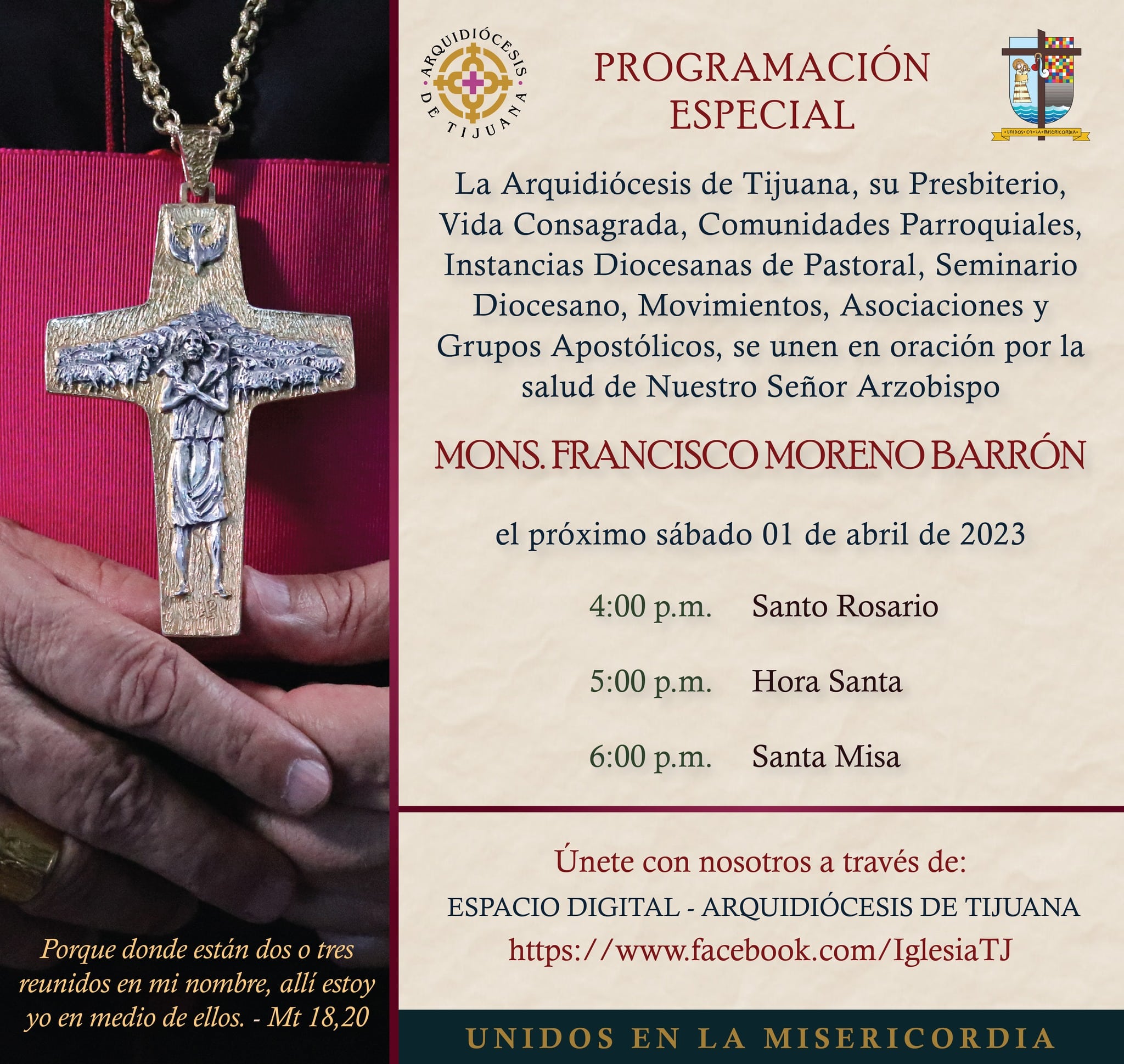 A través de un comunicado, el arzobispo de Tijuana y administrador apostólico de la diócesis de Mexicali, Francisco Moreno Barrón, dio a conocer a los fieles la intervención quirúrgica que se le realizará este Domingo de ramos, justo al iniciar los misterios de la redención que culminarán en la pascua del Señor.