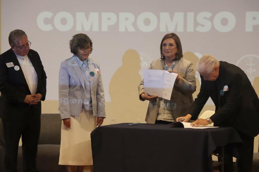 Por la mañana, el candidato Jorge Álvarez, tercer lugar en la preferencia del voto, había firmado el Compromiso por la paz, documento que engloba la propuesta del Núcleo por la paz con lo seis temas urgentes que el futuro gobierno debe atender en un problema que ya no pude esperar. Álvarez acentuó la adhesión al compromiso al recordar también su formación en la Compañía de Jesús y acusando la descomposición provocada por el actual régimen. La firma del Compromiso fue la antesala que sirvió a una pausa hasta la llegada de Xóchitl Gálvez, la representante de Fuerza y Corazón por México cuyo propósito de arrebatar el poder al oficialismo fija su diana en la lacerante descomposición social.