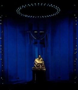 Una vez en el Pabellón del Vaticano, la Pietà fue “escenificada” por Jo Mielziner, diseñador de escenarios de Broadway. La estatua, protegida por un escudo de plexiglás a prueba de balas, fue colocada contra un fondo de terciopelo azul oscuro, con velas votivas y un crucifijo sencillo colgando detrás. Un paseo mecánico permitía a los visitantes pasar frente a la estatua en un tiempo razonable.