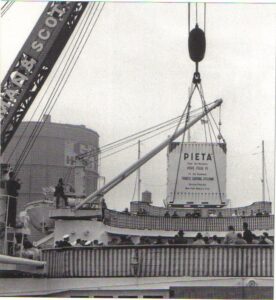 Nelson relata la historia de cómo la Pietà llegó a Queens. Robert Moses, el hombre detrás de la Feria Mundial, tanto en 1964 como en 1939, presionó al Vaticano para construir un pabellón. El Vaticano aceptó, pero dejó claro que la construcción y financiación recaerían en la Iglesia estadounidense. Al principio, los obispos americanos no mostraron mucho entusiasmo. El cardenal Francis Spellman, arzobispo de Nueva York y líder de los obispos americanos en ese momento, dijo al Papa Juan XXIII que si el Vaticano donaba una obra de arte espectacular de su colección, los obispos americanos podrían sacar adelante el proyecto.