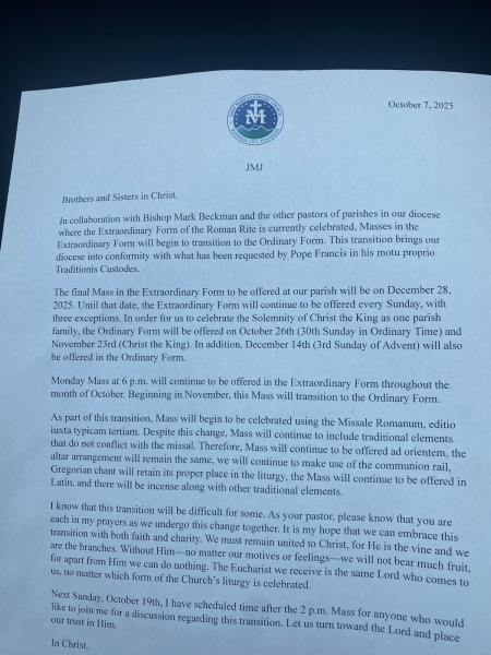 The pastoral letter explains that until that date, the Traditional Mass will continue to be celebrated on Sundays, except on three occasions when it will be replaced by the ordinary form: October 26 (30th Sunday in Ordinary Time), November 23 (Christ the King), and December 14 (3rd Sunday of Advent). The Latin Masses on Mondays will be maintained only in October, also switching to the ordinary form from November onward.