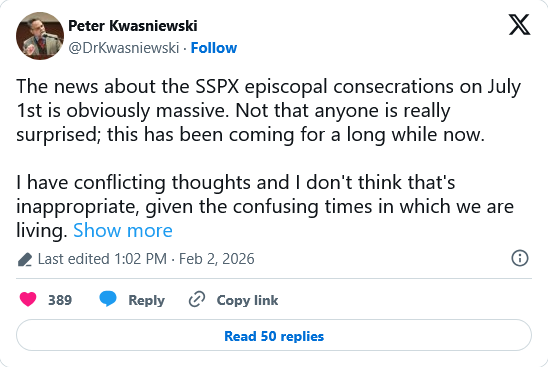 La nouvelle concernant les consécrations épiscopales de la FSSPX le 1er juillet est, évidemment, massive. Ce n’est pas que cela surprenne vraiment qui que ce soit ; cela se profilait depuis longtemps.